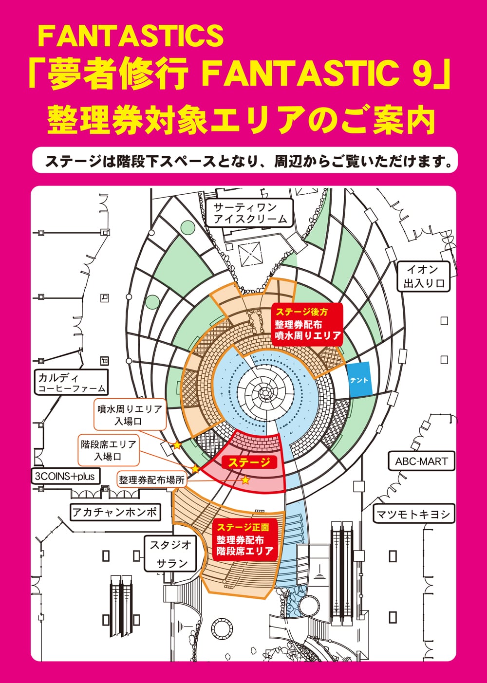 ・整理券番号は先着順ではなく、ランダム配布となります。階段席エリアの整理券を配布終了後、噴水周辺エリアの整理券を配布致します。