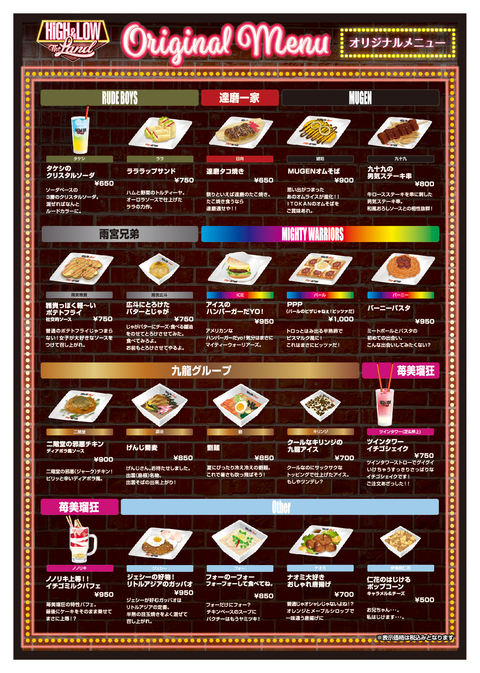 【開催期間】 2017/6/14(水)〜9/10(日) ※オープン日の6/14(水)は15時スタート ※6/20(火)〜6/22(木)、6/27(火)〜6/29(木)は休園 【営業時間】 10:00〜21:00 ※最終入場は20:00 ※遊園地の営業時間とは異なります ※お客様の安全を考慮し、荒天時はイベントが中止になる場合がございます。 【場所】 よみうりランド(東京都稲城市矢野口4015−1) 【内容】 ■「HiGH&LOW THE LAND」 超巨大レストランで出演者が好きなメニューを再現!会場ではグッズも販売! <フードメニュー>