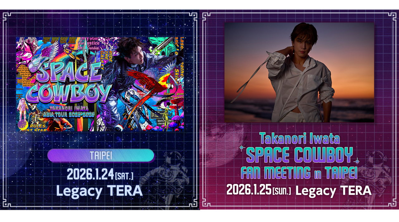 2026/1/24(土)『Takanori Iwata ASIA TOUR 2025-2026 "SPACE COWBOY"』、2026/1/25(日)『Takanori Iwata「SPACE COWBOY」FAN MEETING in TAIPEI』と2日間に渡ってLIVE&FAN MEETINGをTAIPEIのLegacy TERAにて開催します!