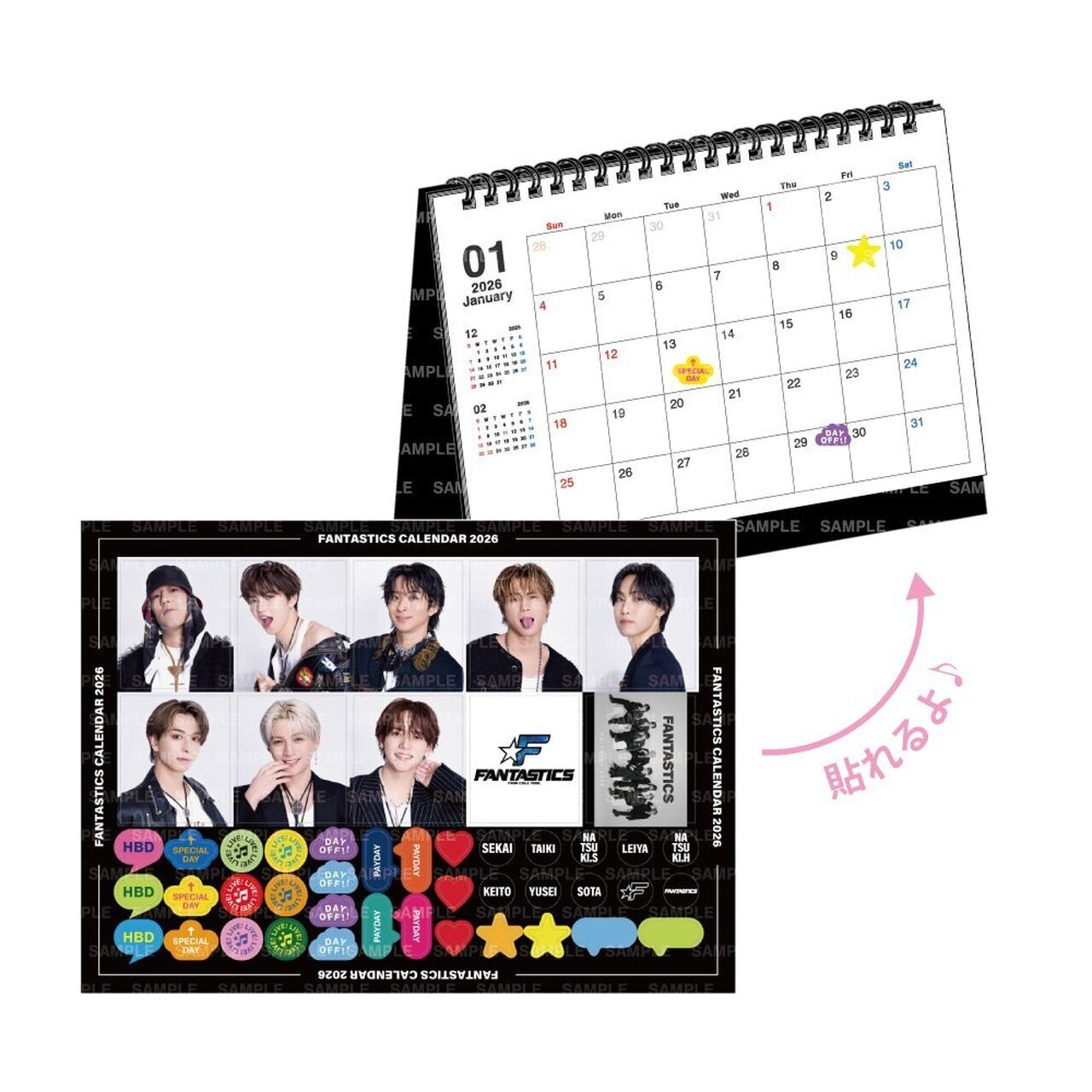壁掛けカレンダーには、メンバー全員が揃った集合フォトのポストカードを、卓上カレンダーには、メンバーのソロカットとスケジュールステッカーが1枚に詰まったスペシャルなステッカーシートをプレゼント!