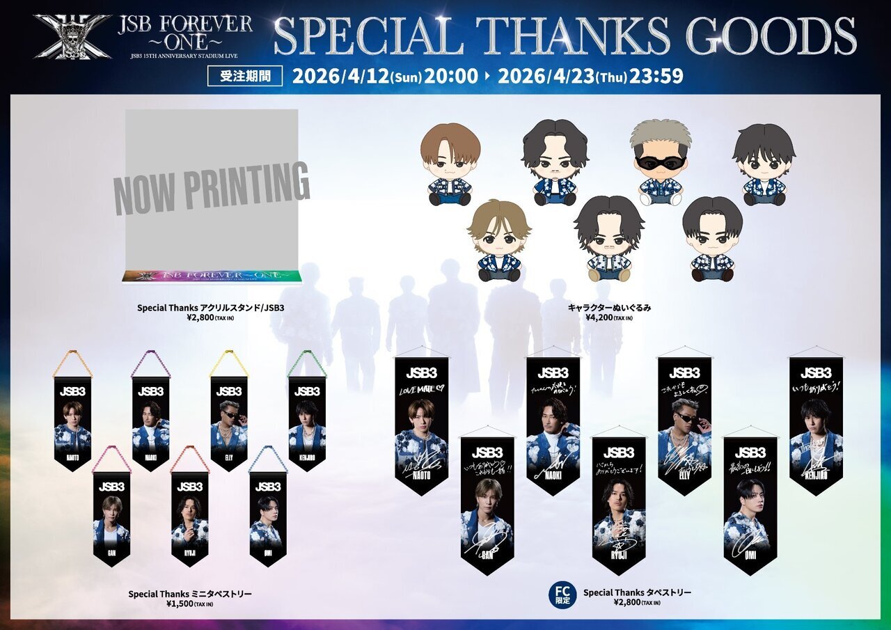 『三代目 J SOUL BROTHERS 15TH ANNIVERSARY STADIUM LIVE "JSB FOREVER 〜ONE〜"』Special Thanks Goods発売決定!!