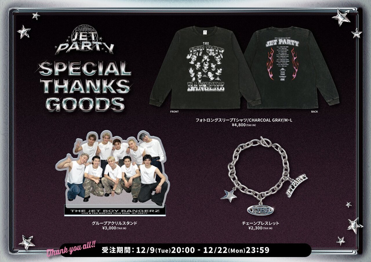 wTHE JET BOY BANGERZ LIVE • FAN MEETING TOUR 2025 `JET PARTY`x‚ÌŠ®‘–‚ð‹L”O‚µ‚ÄAŠF‚³‚ñ‚Ö‚ÌŠ´ŽÓ‚Ì‹CŽ‚¿‚ðž‚ß‚½Special Thanks Goods‚ÌŽó’”Ì”„‚ªŒˆ’è!!