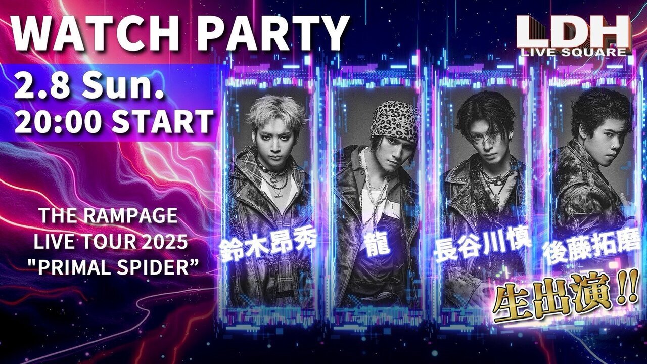 y2/8(“ú)20:00`¶”zMƒXƒ^[ƒg!!zLDH LIVE SQUAREwTHE RAMPAGE LIVE TOUR 2025 "PRIMAL SPIDER"xWATCH PARTY‚É’·’JìTA—´A—é–ØVGAŒã“¡‘ñ–‚ª¶o‰‰I