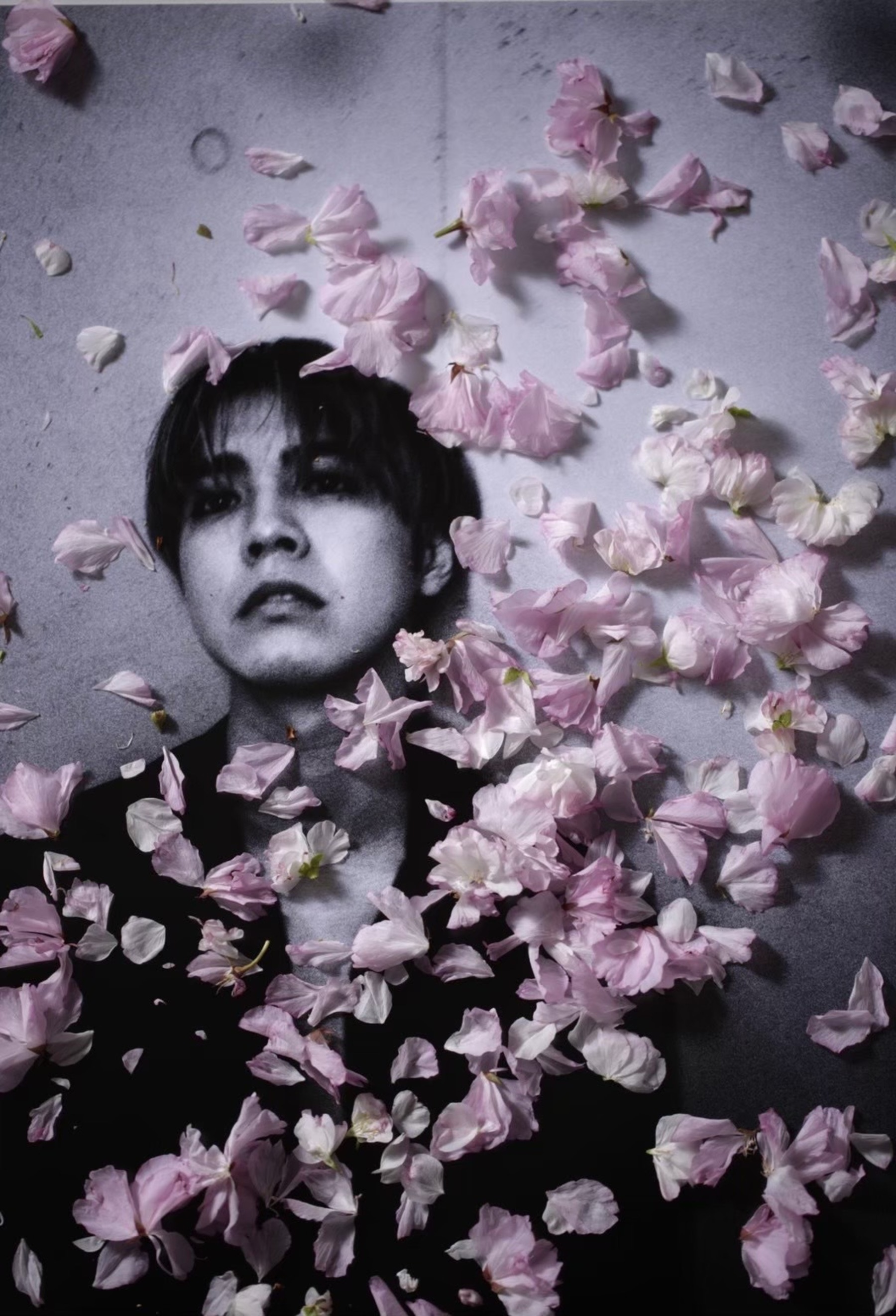 桜の時期に片寄さんと自分がセッションした白黒写真に、フラワーアーティストの尾藤裕子さんが十年目の八重桜を施してくれました。