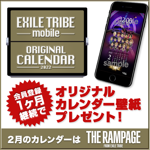 y2ŒŽ‚̃JƒŒƒ“ƒ_[‚ÍTHE RAMPAGEIz2/1(‰Î)12:00‚æ‚è2ŒŽ‚ÌEXILE TRIBE mobileƒIƒŠƒWƒiƒ‹ƒJƒŒƒ“ƒ_[•ÇŽ†”zMƒXƒ^[ƒgI