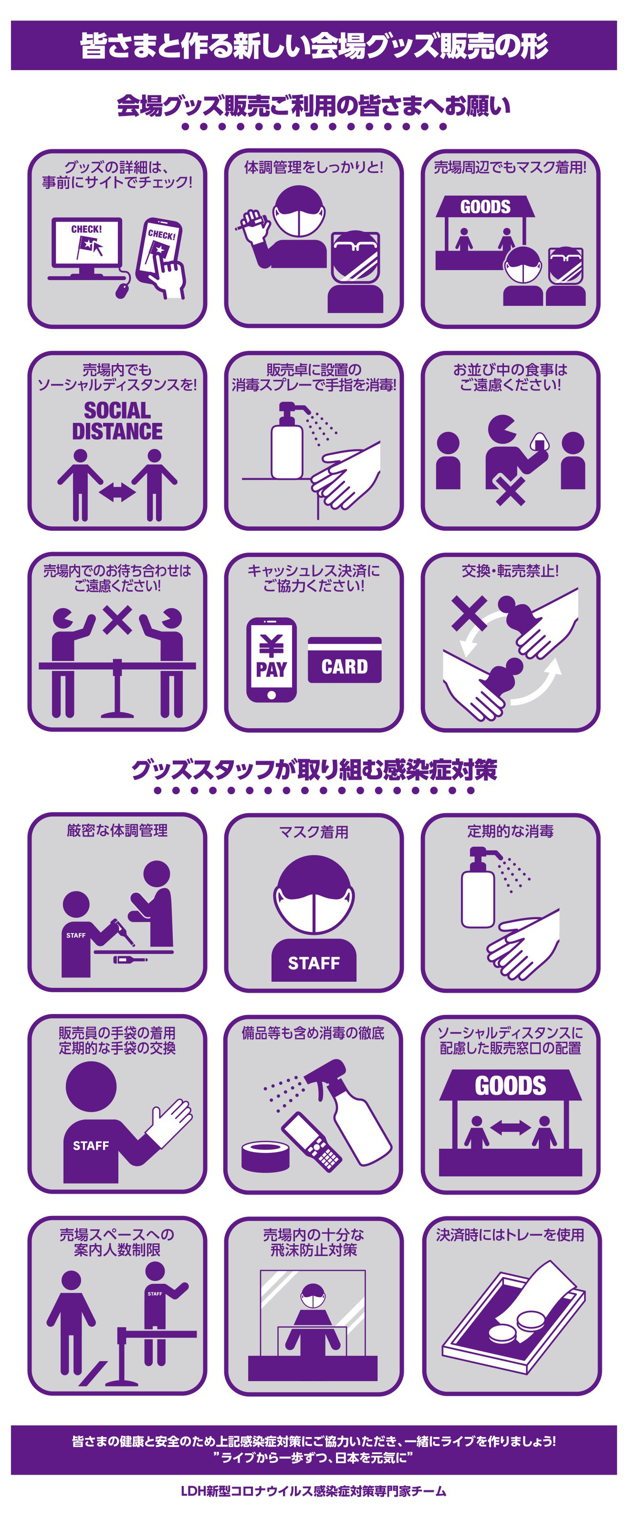 ご来場頂く皆様には、下記の対策項目をご理解いただきコロナ禍でも安全、安心なグッズ販売を一緒につくっていくことへのご協力をお願いいたします。
