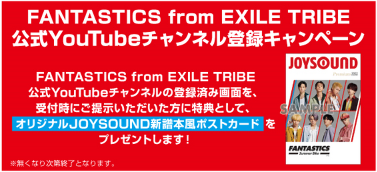 カラオケ受付時に「FANTASTICS from EXILE TRIBE」公式YouTubeチャンネルの登録済み画面をご提示いただいた方に、オリジナル新譜本風ポストカードを1枚プレゼントします。