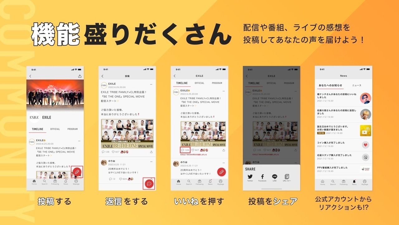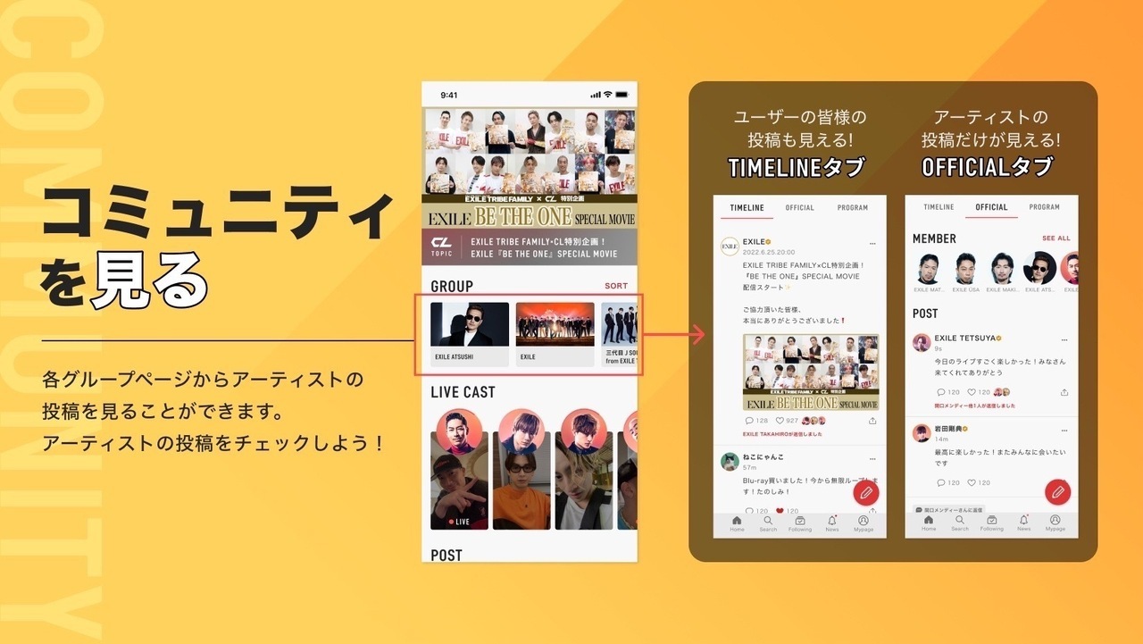 グループごとのタイムラインでLDHアーティストやタレント、ユーザー同士のコミュニケーションを行うことが可能です。