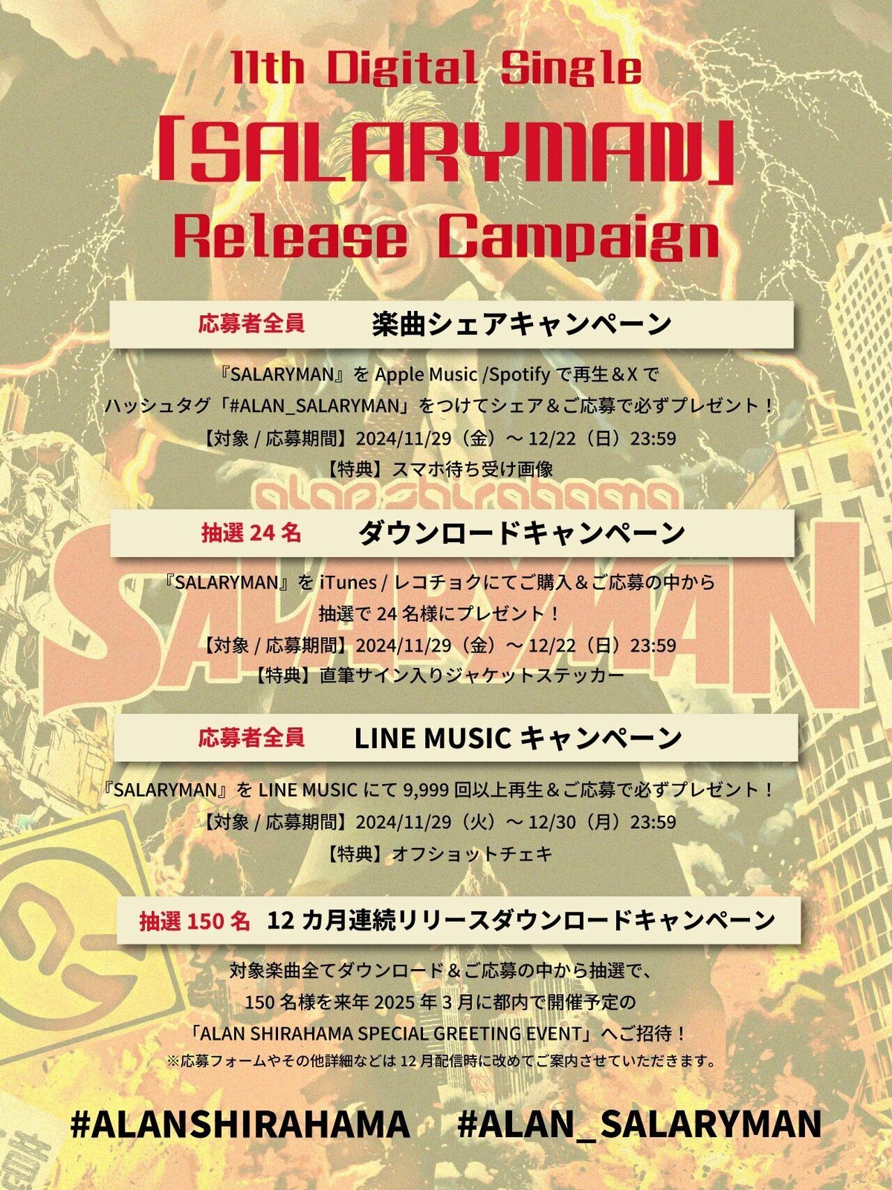 11th Digital Single『SALARYMAN』を、下記対象ストアにて再生&Xでハッシュタグ「#ALAN_SALARYMAN」をつけてシェア投稿のうえ、ご応募いただいた方全員に、“スマホ待ち受け画像”をプレゼントいたします!