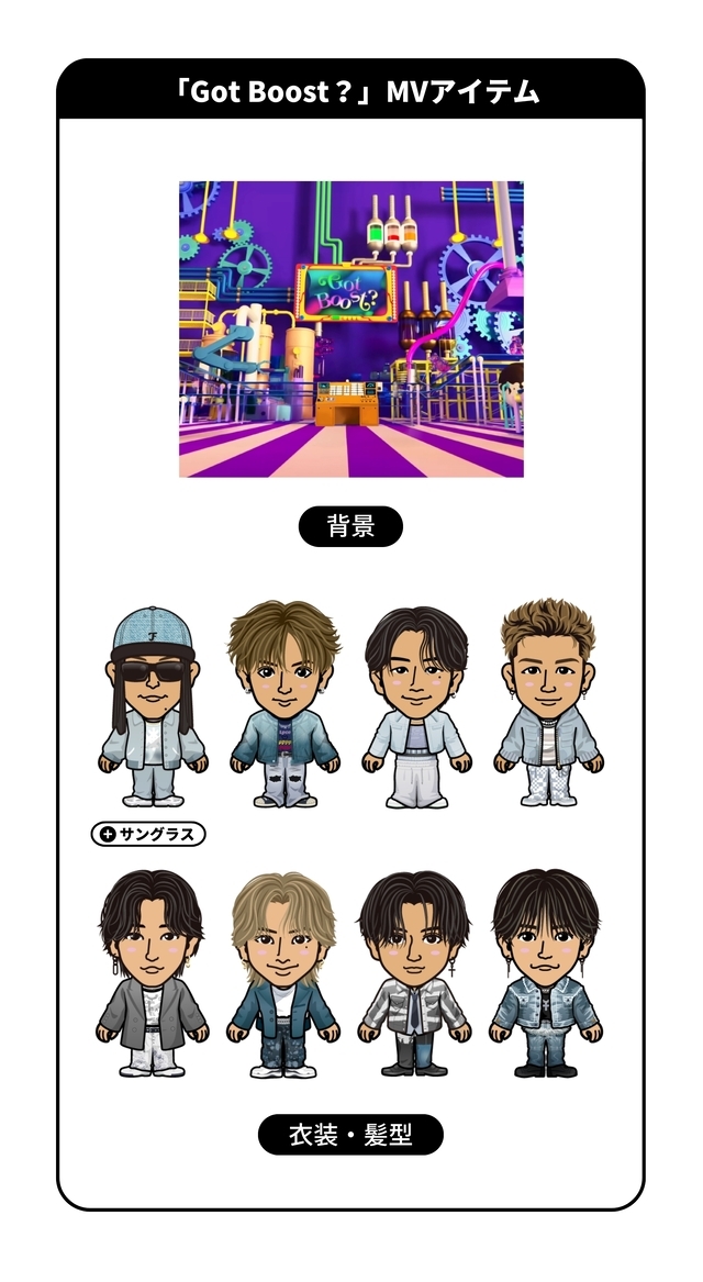 EXILE TRIBE mobileマイページ 2024.12.04 【EXILE TRIBE mobileマイページ】FANTASTICS「Got Boost?」MVアイテム配信!! EXILE TRIBE mobileマイページでは、 FANTASTICS「Got Boost?」のMV公開を記念して、 MVアイテムを配信します!! 是非MVアイテムをGETして、着せ替えを楽しみましょう! ※「Got Boost?」MVアイテムはFANTASTICSのアバターのみ着用可能です。