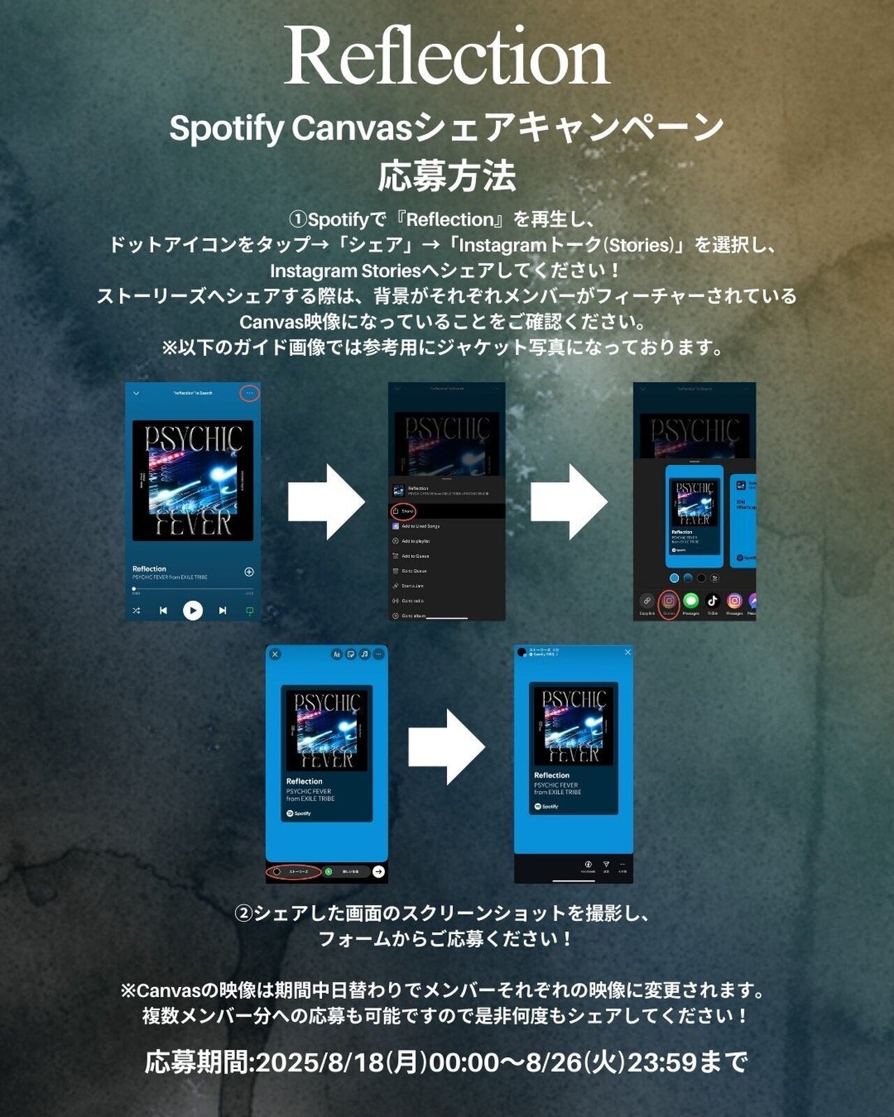 8/18(月)にMusic Videoが公開になるPSYCHIC FEVER 『Reflection』のSpotify Canvasを、Instagramストーリーズでシェアして応募してくださった方から抽選で7名様に"希望メンバーが書いたお名前入り待受画像"をプレゼント!