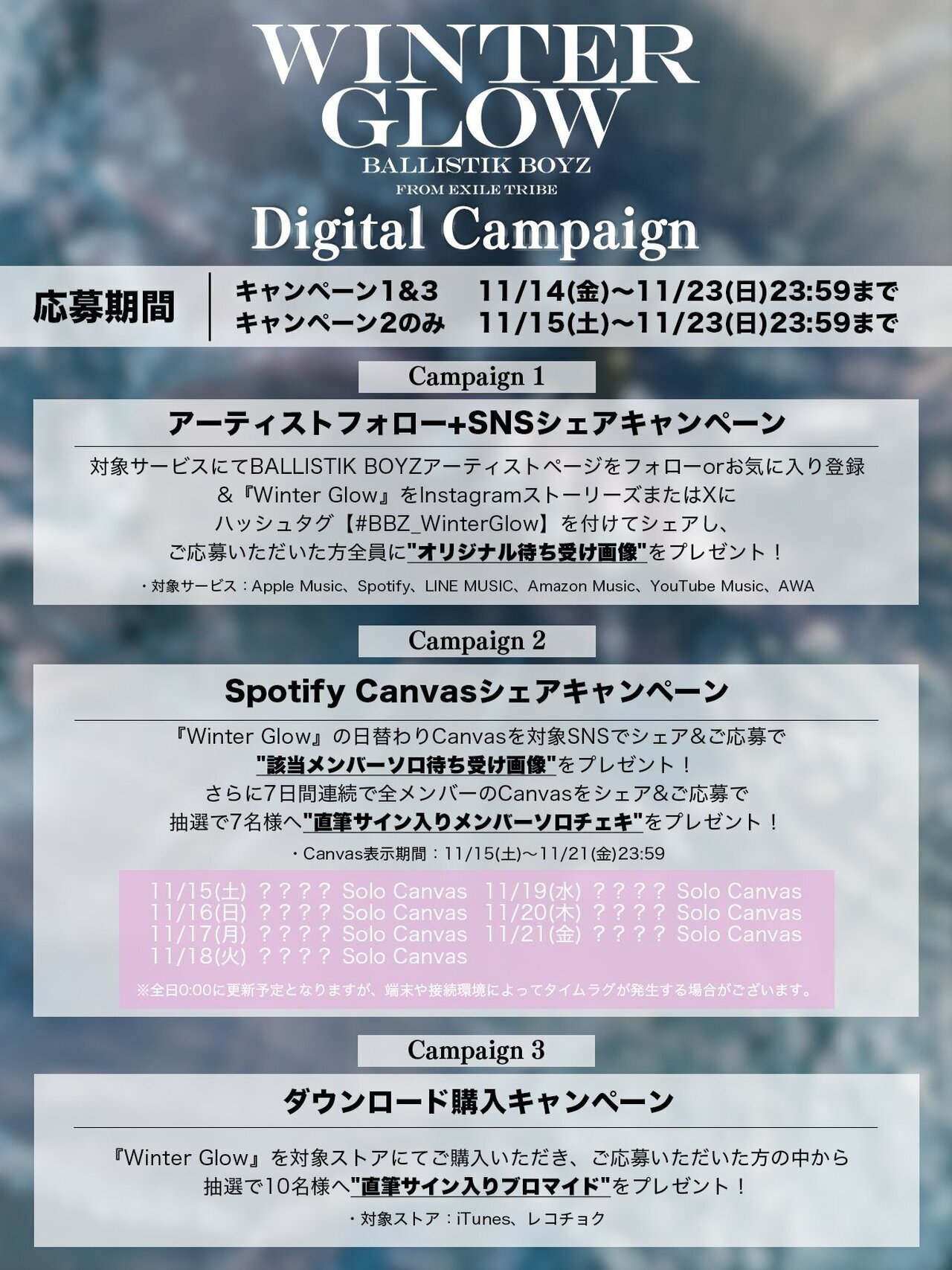 11/14(金)配信 BALLISTIK BOYZ New Single『Winter Glow』リリースを記念して、各サービスでのキャンペーン実施が決定しました!