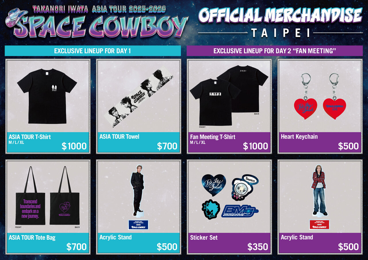 ※2025/12/28(日)24:59(※日本時間)までに有効チケットをご購⼊された方が対象となります。(『Takanori Iwata ASIA TOUR 2025-2026 "SPACE COWBOY"』TAIPEI公演と『Takanori Iwata「SPACE COWBOY」FAN MEETING in TAIPEI』共通)