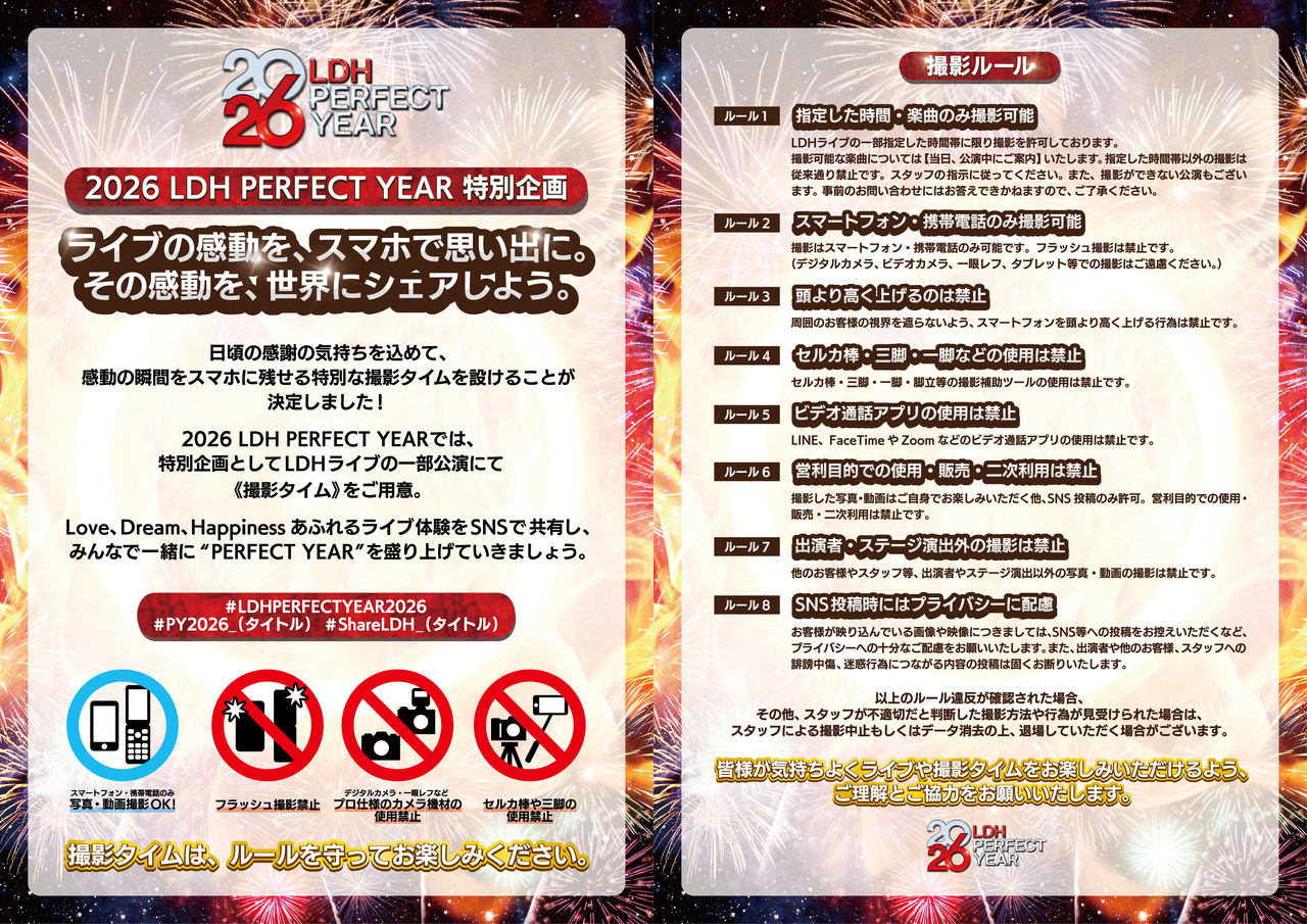 2026 LDH PERFECT YEAR‚Å‚ÍA“Á•ÊŠé‰æ‚Æ‚µ‚ÄLDHƒ‰ƒCƒu‚̈ꕔŒö‰‰‚É‚ÄsŽB‰eƒ^ƒCƒ€t‚ð‚²—pˆÓB