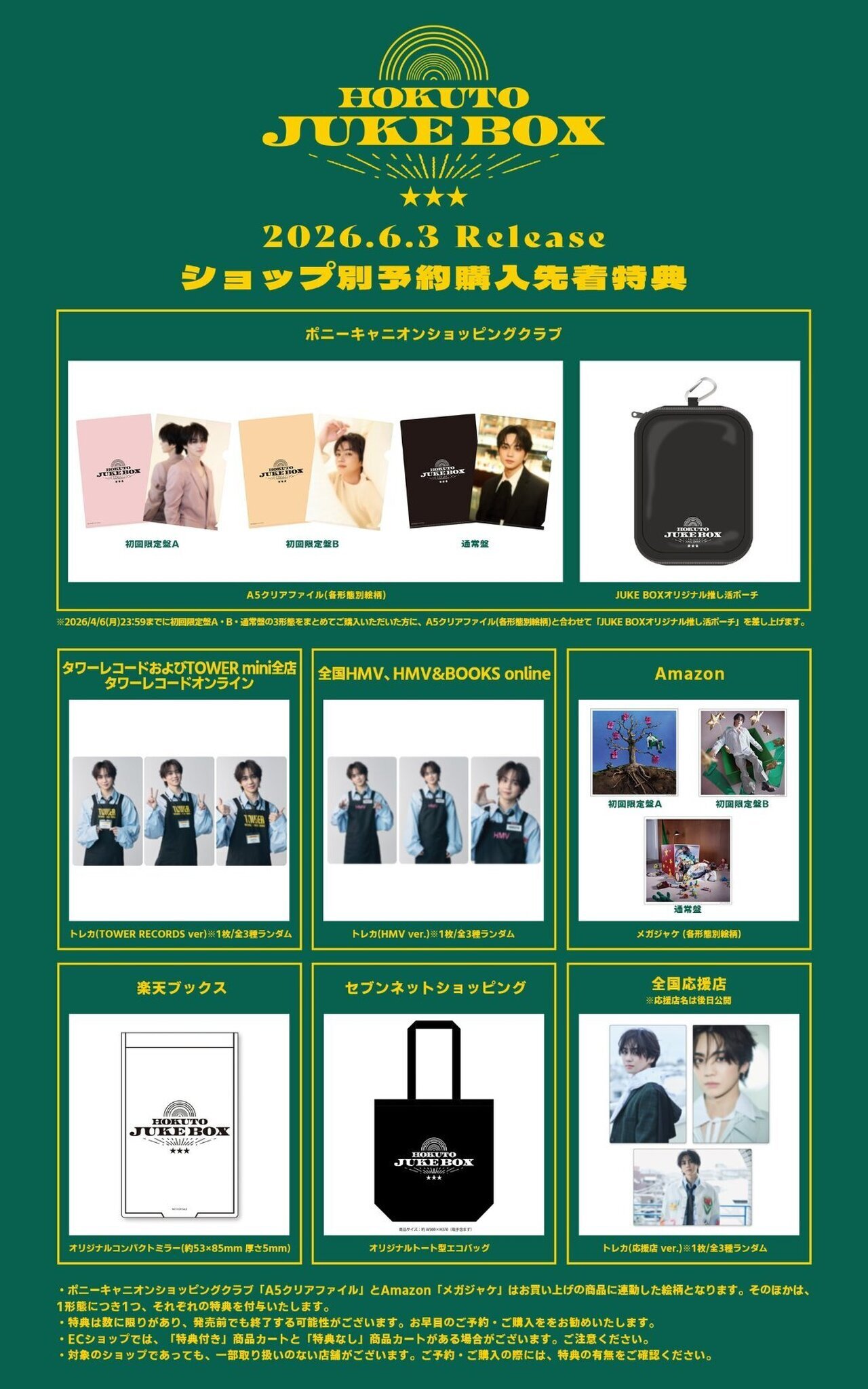 ※2026/4/6(月)23:59までに初回限定盤A・B・通常盤の3形態をまとめてご購入いただいた方に、A5クリアファイル(各形態別絵柄)と合わせて「JUKE BOXオリジナル推し活ポーチ」を差し上げます。