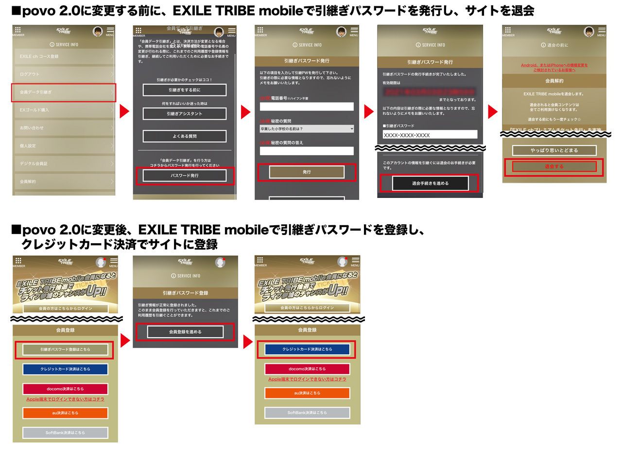 引き継ぎ設定を行わず、「povo2.0」へご変更されますと、月額利用料金の決済が停止し、『EXILE TRIBE mobile』は自動的に退会となります。